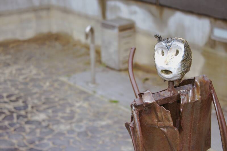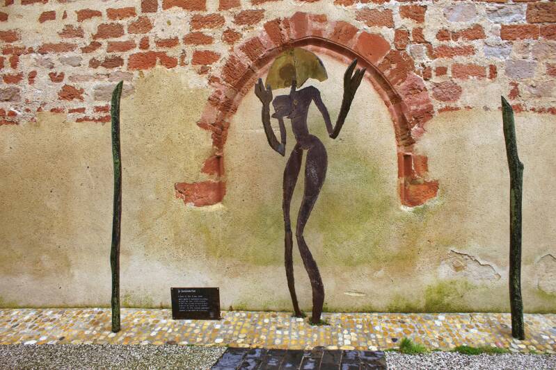 Devant une des façades de l’église Notre Dame de l’Assomption se trouve le Consolamentum. Symbolisé par une femme aux formes simple qui semble émergée d’une porte. Le Consolamentum est le seul sacrement reconnu par les Cathares qui représente à la fois le baptême, la bénédiction et l’extrême-onction.